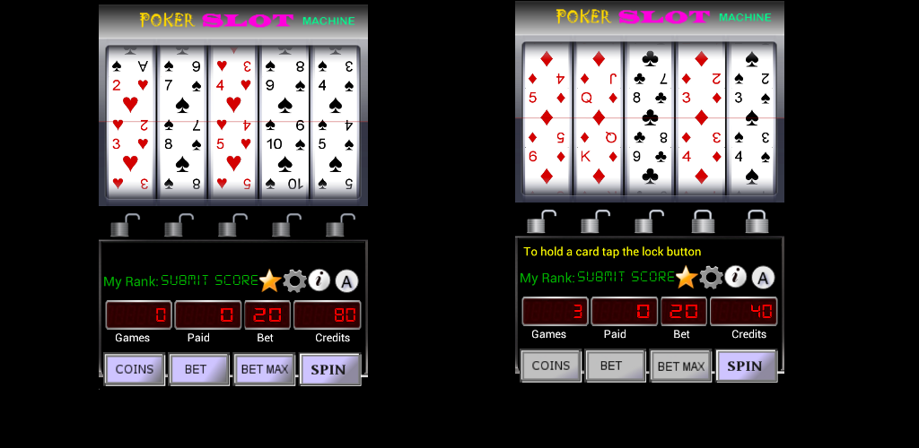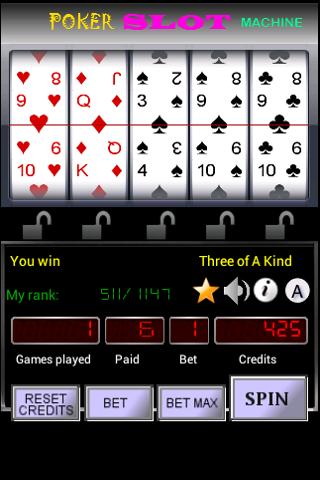 Pokerový slot je simulovaná hra kasino pokeru ve formě slotu, má 5 kol; Každé kolo představuje kartu pokeru ruky a hry vyžaduje dvě otočení, aby určila vítězství, než má druhý přehrávač na výběr držet karty. Telefon nebo znovu nainstalovat hru.Hra má mini bonusové hry video poker, blackjack a poškrábání, zlatý horečka, Halloween bonus.