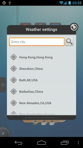 Widget počasí TSF je 3D widgety charateristiky shell TSF. Všechny funkce v widgetech mají závěsný efekt, který vám umožní ovlivnit je jedním dotykem. Kliknutím na název města můžete přistupovat na stránku nastavení počasí a změnit základní nastavení widgetů. Kliknutím na další část může rozvinout/složit widget.Funkce: