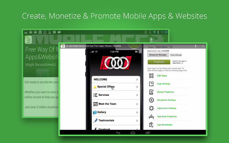 bezplatný způsob vytváření, monetizace a propagace školení mobilních aplikací je navržen tak, aby vám ukázal, jak snadný a zároveň bezplatný může být vývoj mobilních aplikací.provedeme vás krok za krokem jednoduchými procesy vytváření mobilní aplikace buď z již vytvořené šablony, nebo vám ukážeme, jak si vytvořit vlastní šablonu mobilní aplikace.