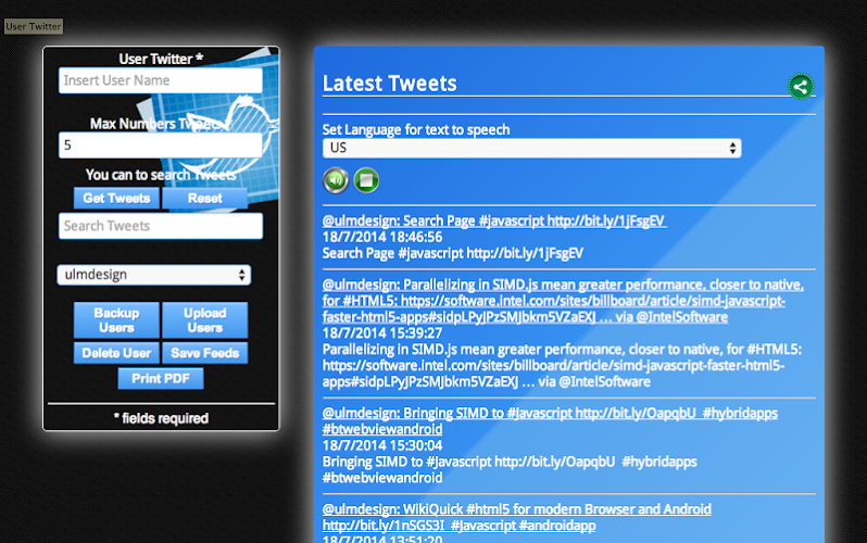 Chcete získat své tweety nebo ty z vaší velké hudby, zábavy, sportu atd.? Twitter kanály vám umožňují vyzvednout je okamžitě. Nejen to, tato aplikace také obsahuje vstup pro vyhledávání obsahu zveřejněného uživatelem slavného Twitteru. Stáhněte si nyní zdarma tento čtenář kanálu a je okamžitě aktualizován o všech zprávách publikovaných v Sympatetic Twitter. Nyní můžete uložit své oblíbené uživatelevydat 1.5 - Export kanálů v PDF a v HTML - Zálohování uživatelů Twitteru do souboru a načíst jej do TwitterFeeds, když nainstalujete tuto aplikaci do jiného mobilního zařízení