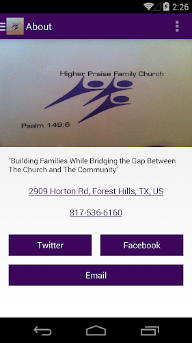 Analýza A Revize Aplikací Pro Android: Higher Praise Family Church, Vyvinuté Společností Unify App. Uvedeno V Kategorii Životní Styl. Aktuální Verze Je 2.3.2, Aktualizována Na 02/02/2017 . Podle Recenzí Uživatelů Na Google Play: Higher Praise Family Church. Dosaženo Více Než 80 Instalací. Higher Praise Family Church Má V Současné Době Recenze 1, Průměrné Hodnocení 5.0 Hvězd