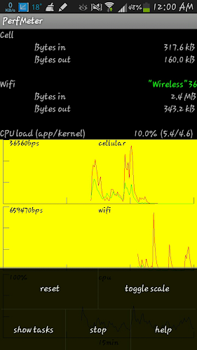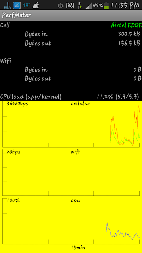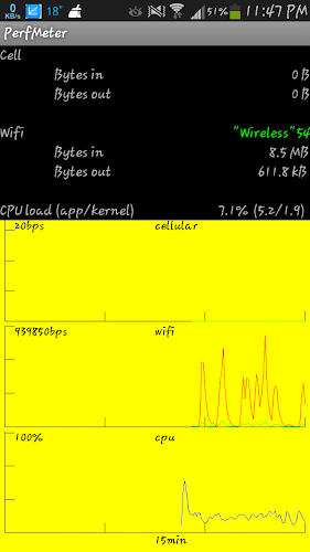 ----------------------------------------------------------------------------------------------------------- uživatel vidí využití sítě a CPU v průběhu času. v mobilním zařízení je energie baterie jedním z nejdůležitějších zdrojů. neočekávané vysoké zatížení sítě a CPU může být orientační spotřebou energie na pozadí. aby bylo umožněno sledování při provádění nějaké jiné činnosti, může měřič výkonu běžet na pozadí a shromažďovat měření.