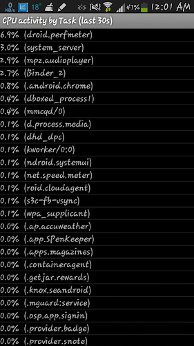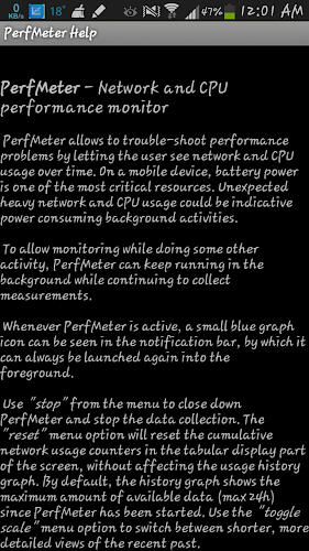měření podrobného využití procesoru je samo o sobě proces náročný na zdroje. proto se samotný perfmeter pravděpodobně objeví na vrcholu seznamu úloh náročných na CPU. jakmile se však zastaví, perfmeter již nespotřebovává žádné zdroje. historie měření je uchovávána v paměti pouze procesem na pozadí perfmetru. pokud má telefon málo paměti - platforma Android se může rozhodnout proces kdykoli zastavit a restartovat, čímž se vymaže nahromaděná historie a shromažďování začne znovu.