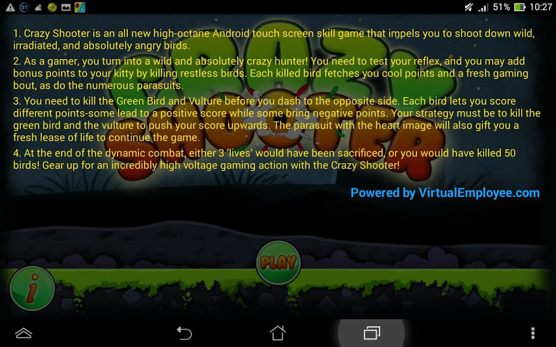 Analýza A Revize Aplikací Pro Android: Crazy Shooter, Vyvinuté Společností VirtualEmployee.com. Uvedeno V Kategorii Arkádové. Aktuální Verze Je 1.0.0, Aktualizována Na 16/06/2014 . Podle Recenzí Uživatelů Na Google Play: Crazy Shooter. Dosaženo Více Než 2 Tisíc Instalací. Crazy Shooter Má V Současné Době Recenze 12, Průměrné Hodnocení 4.4 Hvězd