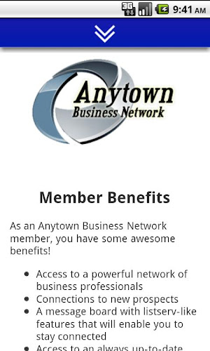 Anytown Business Network je organizací pro podniky v Anytownu, aby společně sdílela zdroje a kontakty.Tato aplikace byla zamyšleně navržena společností Vieth Consulting LLC. Současná verze obsahuje dynamickou strukturu nabídky, která odkazuje přímo na náš web a oblast MMS. Mezi některé příklady patří: