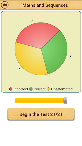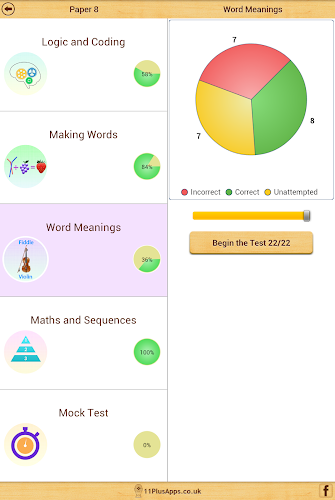 Interaktivní koláčový graf zobrazuje aktuální pokrok pro každé téma. Můžete se dotknout různých barevných řezů koláče a vybrat, zda chcete odpovědět pouze nesprávně odpověděné otázky, bez ohledu na otázky nebo správně zodpovězené otázky. Tato funkce je velmi užitečná pro dosažení 100% skóre v každém tématu.