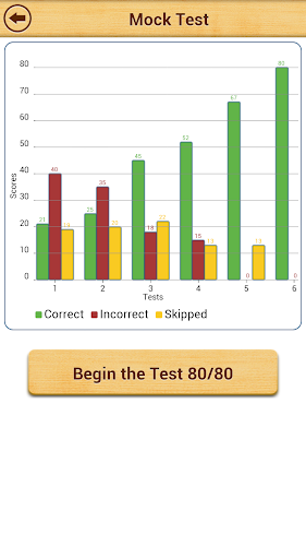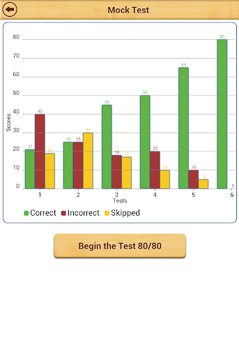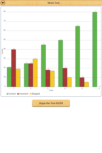 Po praktikování všech typů otázek můžete provést falešný test s 80 otázkami. Zkoumavý test obsahuje otázky náhodně z každého tématu. Skóre pro falešné testy provedené v minulosti se zobrazí v sloupcovém grafu. Je to skvělý způsob, jak sledovat, jak postupujete v falešných testech. Neexistuje žádný limit na to, kolik falešných testů můžete provést.