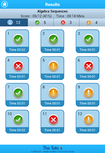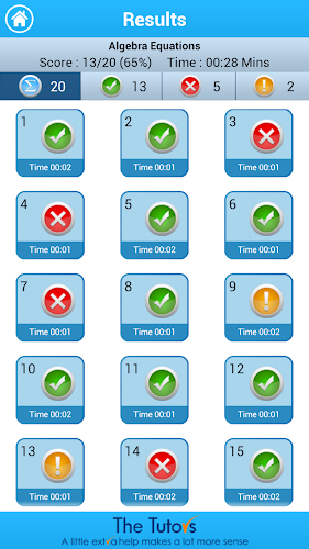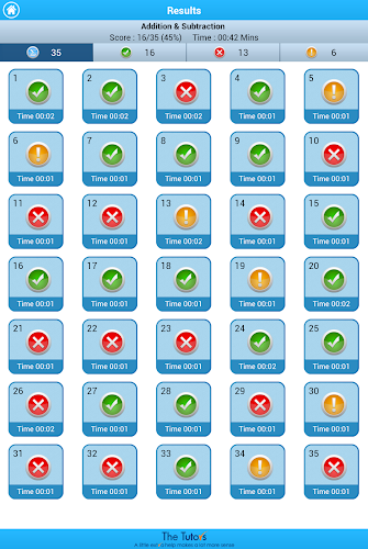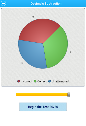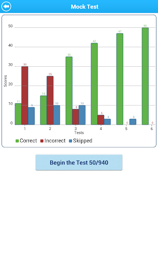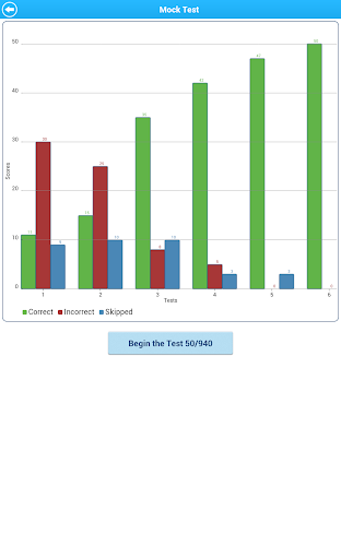 Při dokončení každého testu je uživateli udělen shrnutí otázek správně, nesprávně a přeskočené spolu s časem při každé otázce.