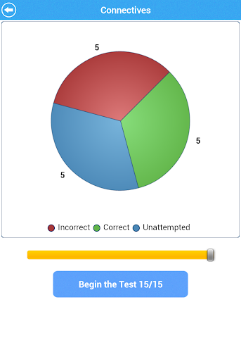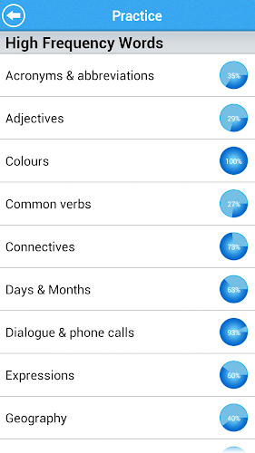 Můžete se vyzkoušet na slovníku pomocí inteligentně navrženého kvízového systému. Všechna slova jsou kategorizována do témat. Praktický modul vám umožňuje znovu odpovědět na otázky nebo otázky, které jste dosud nezabývali. Na konci každého testu můžete vidět skóre a zkontrolovat své odpovědi. Výsečový graf ukazuje váš aktuální pokrok.