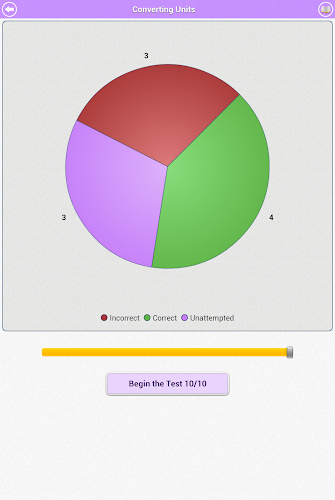 Interaktivní koláčový graf zobrazuje aktuální pokrok pro každé téma. Můžete se dotknout různých barevných řezů koláče a vybrat, zda chcete odpovědět pouze nesprávně odpověděné otázky, bez ohledu na otázky nebo správně zodpovězené otázky. Tato funkce je velmi užitečná pro dosažení 100% skóre v každém tématu.