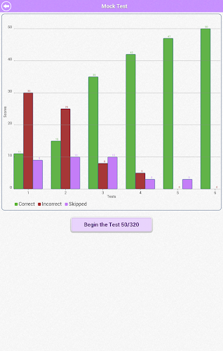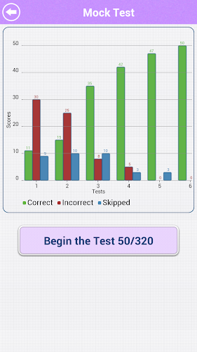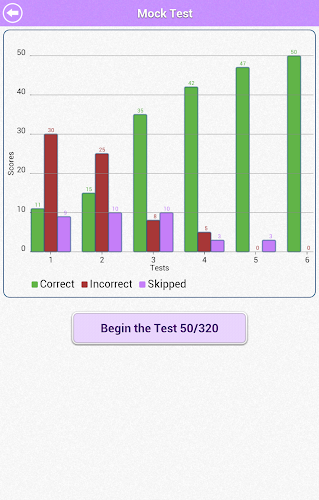 Poté, co jste procvičili všechny typy otázek, můžete provést falešný test s 50 otázkami. Zkoumavý test obsahuje otázky náhodně z každého tématu. Skóre pro falešné testy provedené v minulosti se zobrazí v sloupcovém grafu. Je to skvělý způsob, jak sledovat, jak postupujete v falešných testech. Neexistuje žádný limit, kolik simulovaných testů můžete provést.