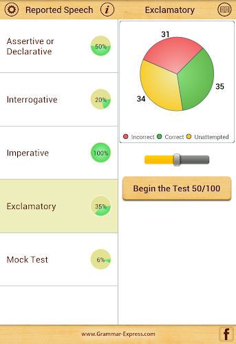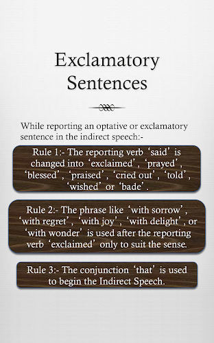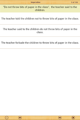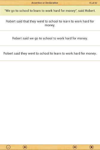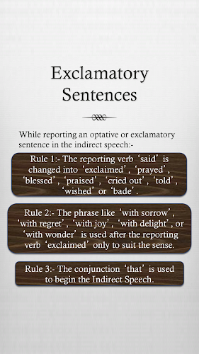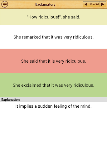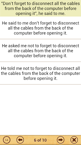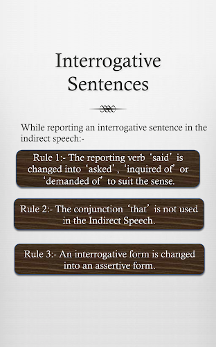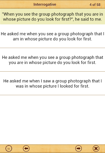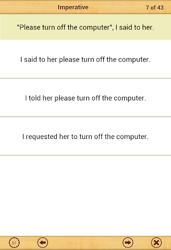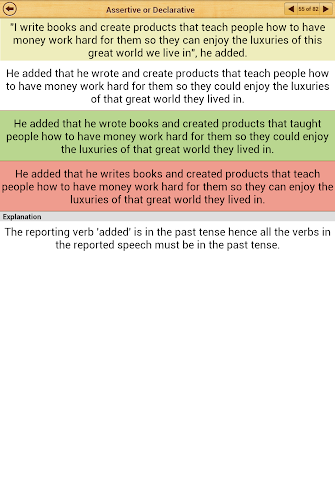 ** Více než 50 stránek lekcí gramatiky. Obsahuje více než 50 stránek lekcí vysvětlující pravidla pro přeměnu přímé řeči nanepřímou řeč s několika příklady. Můžete se naučit gramatická pravidla, prostudovat příklady a testovat