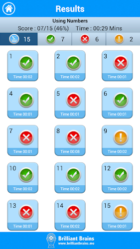 Při dokončení každého testu je uživatel správně zodpovězen, nesprávně a přeskakuje se spolu s časem. Každou otázku lze zkontrolovat a všechny otázky mají vysvětlení odpovědi.