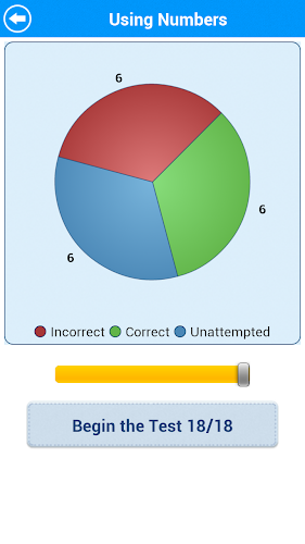 Interaktivní koláčový graf zobrazuje aktuální pokrok pro každé téma. Můžete se dotknout různých barevných řezů koláče a vybrat, zda chcete odpovědět pouze nesprávně odpověděné otázky, bez ohledu na otázky nebo správně zodpovězené otázky. Tato funkce je velmi užitečná pro dosažení 100% skóre v každém tématu.