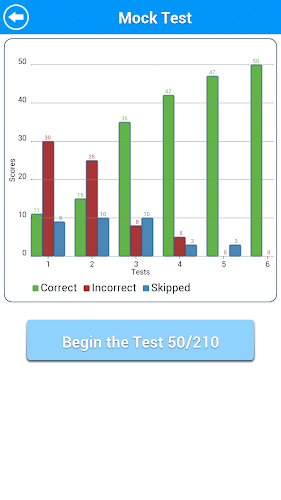 Po procvičování všech typů otázek můžete provést falešný test s 50 otázkami. Zkoumavý test obsahuje otázky náhodně z každého tématu. Skóre pro falešné testy provedené v minulosti se zobrazí v sloupcovém grafu. Je to skvělý způsob, jak sledovat, jak postupujete v falešných testech. Neexistuje žádný limit, kolik simulovaných testů můžete provést.