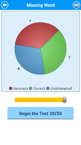 Interaktivní koláčový graf zobrazuje aktuální pokrok pro každé téma. Můžete se dotknout různých barevných řezů koláče a vybrat, zda chcete odpovědět pouze nesprávně odpověděné otázky, bez ohledu na otázky nebo správně zodpovězené otázky. Tato funkce je velmi užitečná pro dosažení 100% skóre v každém tématu.