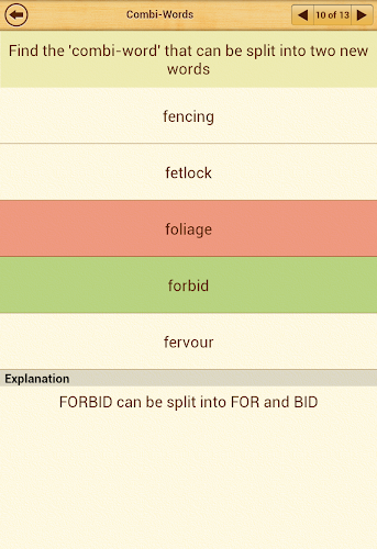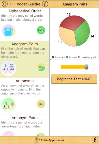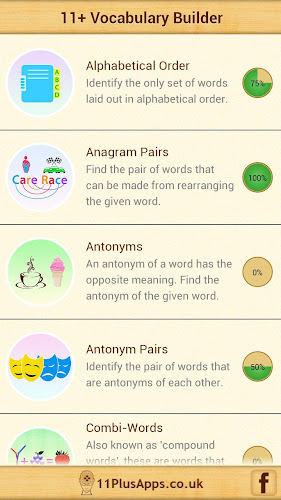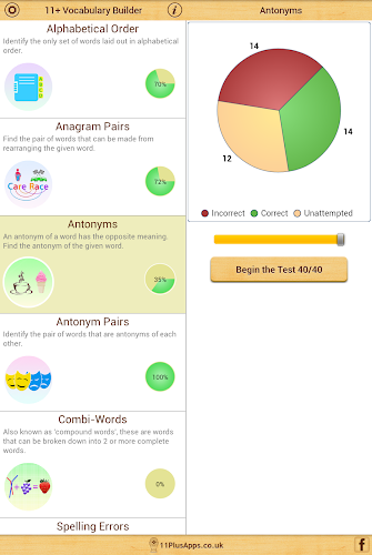 V Anglii existuje 164 gramatických škol, většina z nich v rámci svého výběrového procesu stanovila testy verbálního uvažování, 50-75% otázek slovního uvažování je založeno na slovní zásobě.11+ App Vocab Builder pomáhá dětem posílit jejich slovní zásobu použitím různých studijních technik. Tato interaktivní aplikace je navržena ve formátu kvízu a pokrývá se následující témata: