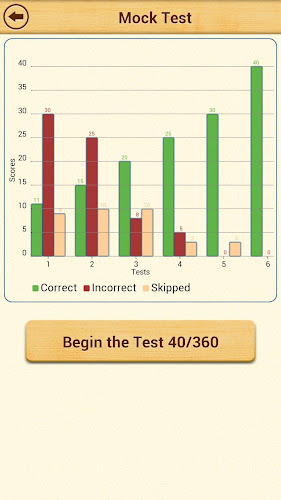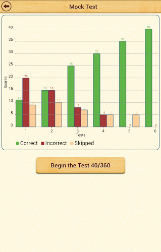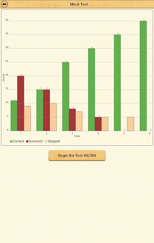 Poté, co jste procvičili všechny typy otázek, můžete provést falešný test s 50 otázkami. Zkoumavý test obsahuje otázky náhodně z každého tématu. Skóre pro falešné testy provedené v minulosti se zobrazí v sloupcovém grafu. Je to skvělý způsob, jak sledovat, jak postupujete v falešných testech. Neexistuje žádný limit, kolik simulovaných testů můžete provést.