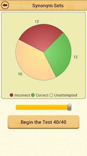 Interaktivní koláčový graf zobrazuje aktuální pokrok pro každé téma. Můžete se dotknout různých barevných řezů koláče a vybrat, zda chcete odpovědět pouze nesprávně odpověděné otázky, bez ohledu na otázky nebo správně zodpovězené otázky. Tato funkce je velmi užitečná pro dosažení 100% skóre v každém tématu.