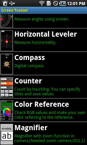 sada 21 nástrojů obrazovky pomocí obrazovky chytrého telefonu. (různé signály, značky, měřicí nástroje atd.)1) LED svítilna: LED svítilna využívající blesk fotoaparátu LED blesk.( nové!!)