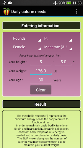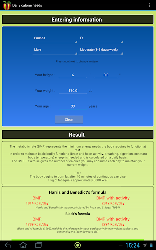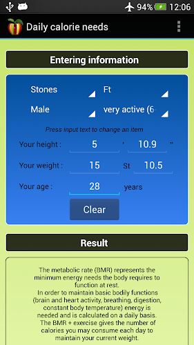 Tato aplikace umožňuje vypočítat vaše denní potřeby kalorií, pro muže a ženy!Vypočítat bazální metabolickou rychlost (BMR):