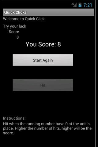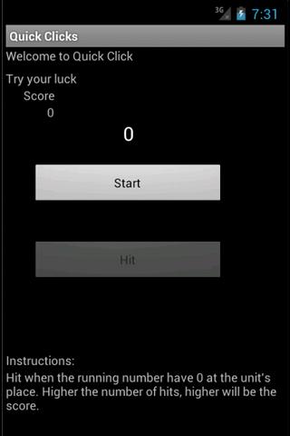 Click start to start the counter that runs from 0 to 100, in between whenever there is a number with units place as 0 (numbers:0,10,20,30,40,50,60,70,80,90,100), click hit button to increase your score by one.