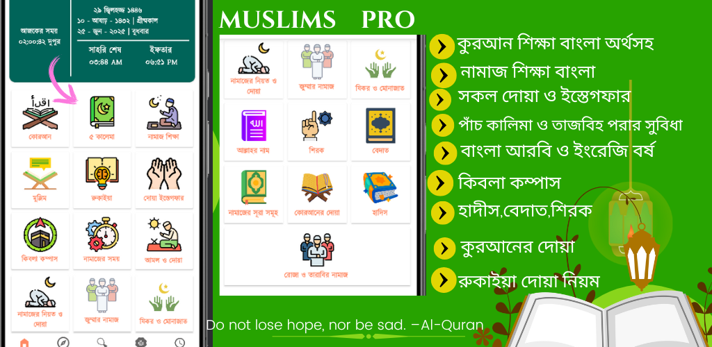 Korán, Namaz Timings, Dua, Qibla, Ramadán, 99 jmen, Namaz Education, Islámská muslimská aplikace