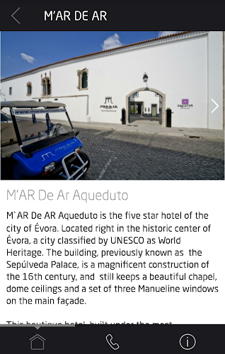skupina m`ar de ar nabízí dva báječné hotely, akvadukt m`ar de ar, 5hvězdičkový hotel a m'ar de ar muralhas, 4hvězdičkový hotel. oba se nacházejí v historickém centru Évory.Évora je od roku 1986 klasifikována jako světové dědictví UNESCO a nyní můžete zjistit, co město nabízí, jiným způsobem.