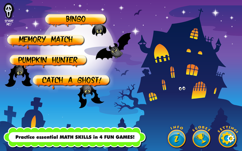 jeden z nejlepších způsobů, jak si děti procvičit základní matematické dovednosti pro úspěch v kurikulu před základním až 4. ročníku! Naučte se okamžitě rozpoznávat čísla a odpovídat na problémy se sčítáním, odčítáním, násobením a dělením ve čtyřech poutavých hrách s halloweenskou tématikou. skvělý způsob, jak zlepšit studijní výkon vašeho dítěte.