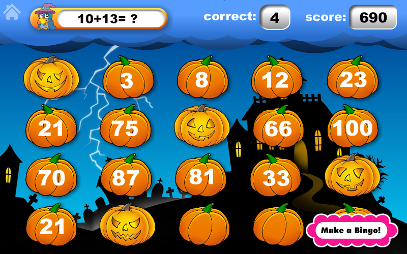 Dobrodružná matematika nabízí výběr ze čtyř matematických her: lovec dýní, bingo, pexeso a chycení ducha. každá hra může být přizpůsobena jedinečným potřebám každého dítěte díky výběru z pěti cvičných matematických oblastí a tří úrovní obtížnosti.