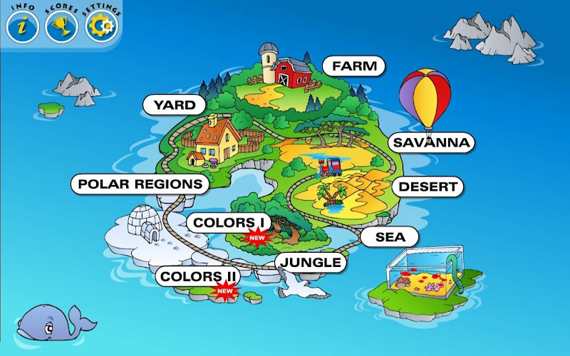 • The Toddler Fun Learning Games celek z 11 úžasných, barevně ilustrovaných nastavení: