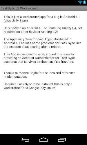only needed on android 4.1 or samsung galaxy s4, not required on other devices running 4.2!the app encryption for paid apps introduced in android 4.1 causes some problems for task sync, like the account disappearing after a reboot.