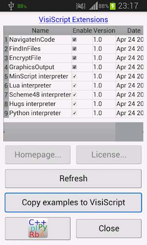 K použití popsaných funkcí a tlumočníků skriptů potřebuje tato aplikace nainstalovanou a volně dostupnou aplikaci VisiScript (https://www.google.com/url?q=https://play.google.com/store/apps/details?id = de.mneuroth.visiscript) nebo aplikace SciteQt (https://play.google.com/store/apps/details?id=org.scintilla.sciteqt)
