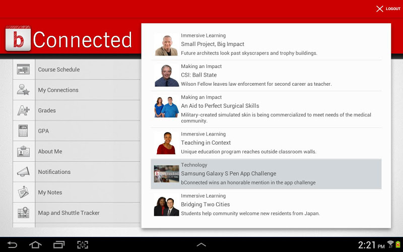 ------------------------------------------------------přepracováno konkrétně pro řadu zařízení Samsung Galaxy Note zařízení, poskytuje kdykoli, kdekoli, kdekoli přístup k vašim plánovaným třídě, třídy, řezy, jízdní desky kampusu, důležitá akademická oznámení a události. Navrženo pro telefony a tablety a poskytuje BContects informace, kde a kde je nejvíce potřebujete. Můžete také vytvářet spojení na základě vašich spolužáků, lektorů, instruktorů kurzu a kamarádů z Rideshare.