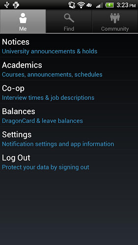 Tato aplikace poskytuje uživatelům starší zařízení Android (sendvič před 4,0/zmrzlinou) přístrojovou desku klíčových informací ve webovém portálu Drexelone spolu s užitečnými funkcemi a informacemi kampusu. Uživatelé s Android...