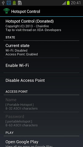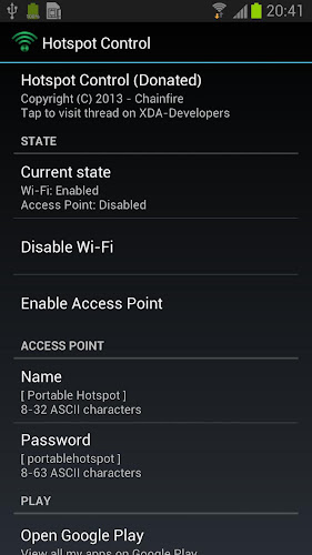 Hotspot Control je malá aplikace, která umožňuje nebo deaktivuje přenosnou funkčnost hotspotu společnosti Android. Obvykle byste to mohli udělat jen v nastavení Android, ale na některých zařízeních je tato možnost skrytá, nebo funguje pouze tehdy, pokud máte vloženou SIM. ve skutečnosti stále přítomné a funkční na zařízení. Zakořenění je obvykle vyžadováno.Toto není navrženo tak, aby porazilo ochranu tetheringu vašeho nosiče, nebo vám umožnilo pouhých volných - pro některé lidi to dělá (záleží na tom, jak je tato ochrana implementována), ale to není to, pro co byla aplikace vyrobena. Není možné si stěžovat, že to pro vás nedělá. Tato aplikace je navržena tak, aby obcházela některé problémy při nastavování * lokálního * hotspotu, aby vaše zařízení mohla komunikovat mezi sebou, * ne * s internetem (i když to také funguje na několika zařízeních).