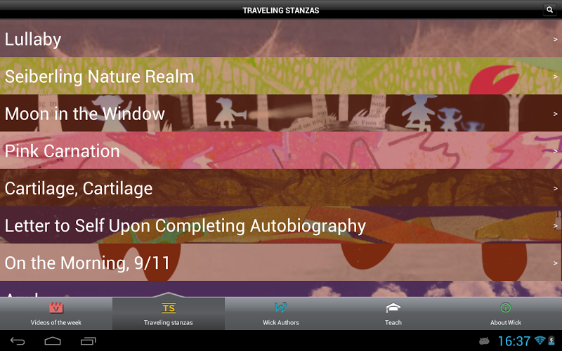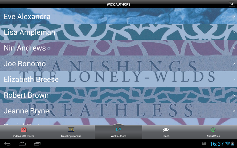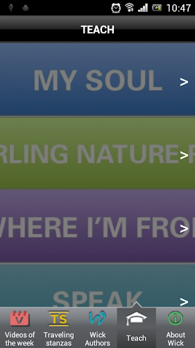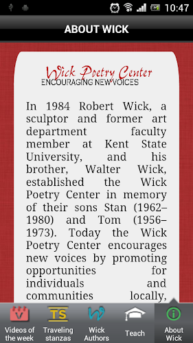univerzální aplikace centra poezie wick přináší vzrušující události centra, autory a dosah přímo na dosah ruky. funkce zahrnují:•oceněný projekt cestovatelských stanz ™