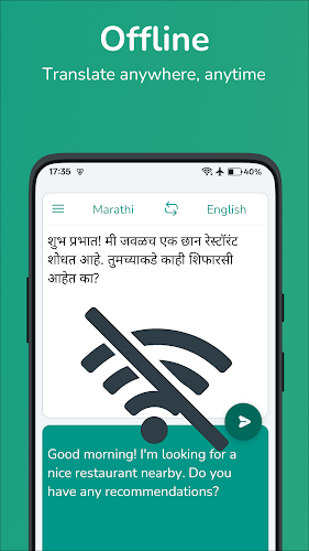 It's one of the best translating app I have found I can say . Very much useful with precise meaning of things searched and accurate .Only sometimes some words get translated slightly different from the actual Marathi words spoken ,apart from that nothing else to complain. Would highly recommend anyone to download and use it as and when required...