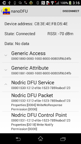 Aplikace je nástroj k objevování a prozkoumání se službami a charakteristikami pro periferní zařízení BLE. V aplikaci se shromažďuje více než 340 UUID, včetně uvedených UUIDS od Bluetooth SIG a několika známých soukromých UUID. Vysvětlena naskenovaná pole EIR, což je užitečné pro kontrolu reklamních informací. Podporována je charakteristická I/O (čtení/zápis) a známá transparentní (UART) služba. Připojení BLE pro čip duálního režimu je automaticky povoleno. Problém s dlouhým paketem (> = 20 bajtů) Android BLE je vyřešen automatickou segmentací paketů. Horké klíče pro test propustnosti (20 ~ 10kbytes) lze vybrat z nabídky I/O aktivit.Poznámka: