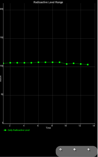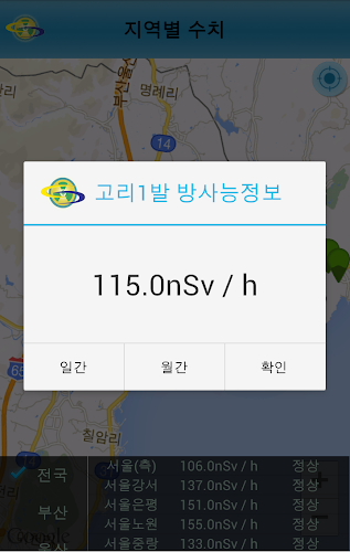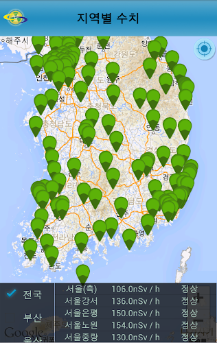 Tato mobilní aplikace pro shromažďování údajů Institutu pro jadernou bezpečnost (KINS), Korea Hydro a Nuclear Power Co., Busan environmentální záření detektor, který dává známku na mapě, minulé trendy ukazují záření.