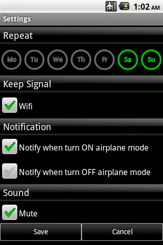 Toto je jednoduchá aplikace Auto Airplane Mode. Můžete naplánovat režim letadla jednou nebo každý den. umožnit vám udržet stav WiFi, když se automaticky zapnete režim letadla. Stiskněte tlačítko nabídky pro nastavení a...