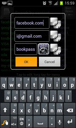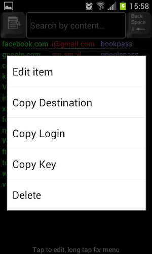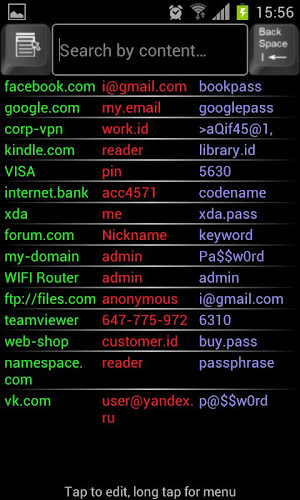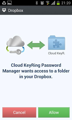 App ukládá údaje o osobním účtu v šifrované databázi umístěné ve vaší oblasti cloudového úložiště Dropbox. Pokud s touto žádostí nejste spokojeni, můžete své výdaje vrátit zpět odinstalováním do 15 (patnácti) minut od okamžiku, kdy jste ji koupili. Počítače, smartphony a tablety. Databáze je uložena na Cloud Storage Dropbox ve složce aplikace ”/Apps/Cloud Keyring Správce hesel/”. Umístěte tam keyringdesktop.jar a spusťte jej z jakéhokoli plochy s jakýmkoli operačním systémem, abyste si prohlédli svá citlivá data.importovat databázi bezplatné verze Kopírovat soubor [config.bin] z [Dropbox/Cloud Keyring Free] do složky [Dropbox/Apps/Cloud Manager]. databáze účtu. Master-Key je heslo vynalezené sami pro šifrování vašich dat. Může to být jakákoli posloupnost písmen, číslic nebo čísel podle vašeho výběru. Nezapomeňte prosím na hlavní klíč, abyste se vyhnuli ztrátě vašich dat kvůli neschopnosti dešifrovat databázi. Pokud chcete importovat databázi účtu, měli byste nahradit existující soubor „Apps/Cloud Keyring Heslo Správce hesel/config.bin“ pomocí databázového souboru „/mnt/sdcard/config.bin“, který je také možné, aby se soubor symchronizoval. User.