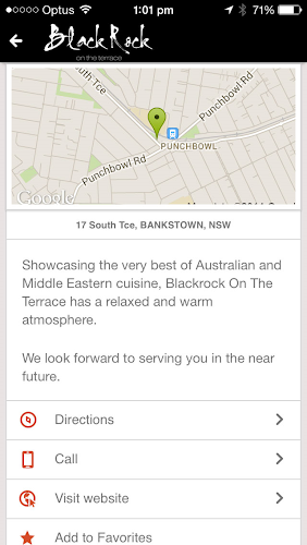 Blackrock na terase restaurace se nachází v bankstown sydney Austrálie.tato aplikace obsahuje věrnostní program společnosti blackrock, online objednávky, obsah menu, kupóny, facebookový kanál a mnoho dalšího.