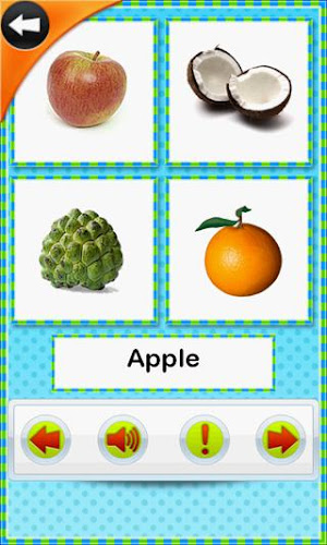 - po výuce o ovoci a zelenině je k dispozici testovací režim, abyste viděli jejich znalosti a je to opravdu zábavné a zlepšuje jejich paměť také pomocí skutečných obrázků.