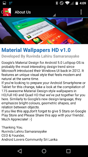 Analýza A Revize Aplikací Pro Android: Material Wallpapers HD by Ruvee Apps Store, Vyvinuté Společností Ruvee Apps Store. Uvedeno V Kategorii Personalizace. Aktuální Verze Je 1.0, Aktualizována Na 27/01/2015 . Podle Recenzí Uživatelů Na Google Play: Material Wallpapers HD by Ruvee Apps Store. Dosaženo Více Než 500 Instalací. Material Wallpapers HD by Ruvee Apps Store Má V Současné Době Recenze 19, Průměrné Hodnocení 4.3 Hvězd