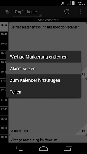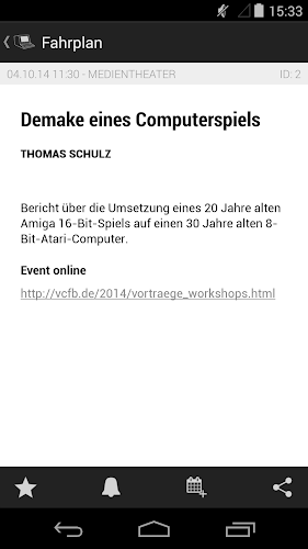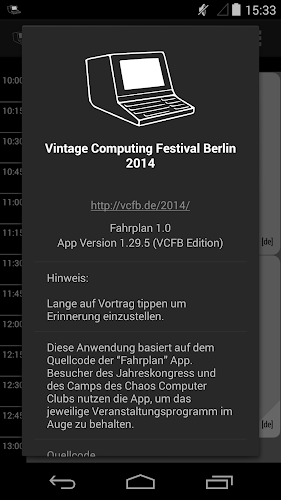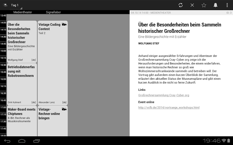 Program pro festival Vintage Computing Festival Berlin (VCFB) v Pergamon-Palais http://vcfb.de/2014/ Funkce:##***** * Podporované jazyky: německé, angličtiny (s výjimkou programových textů) Obsahové otázky týkající se programu...