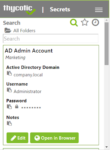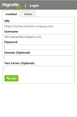 POZNÁMKA: Tato aplikace vyžaduje placený účet za tycotický tajný server. Pokud máte zájem o správu hesel Enterprise, zahájte zkušební verzi tajného serveru nainstalovaného na www.thycotic.com. Získejte přístup k účtu Server...