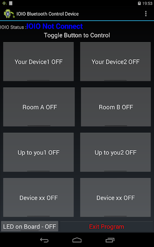 Aplikace pro ovládání zařízení IOIO Bluetooth je umožnit ovládat různá elektrická zařízení až do 8 zařízení a nezávisle ovládat.Použijte mobilní zařízení Android Bluetooth k dálkovému ovládání vašich zařízení pomocí IOIO desky a Bluetooth Dongle. s reléovou deskou. (a může testovat ovládací prvek LED na desce ioio)