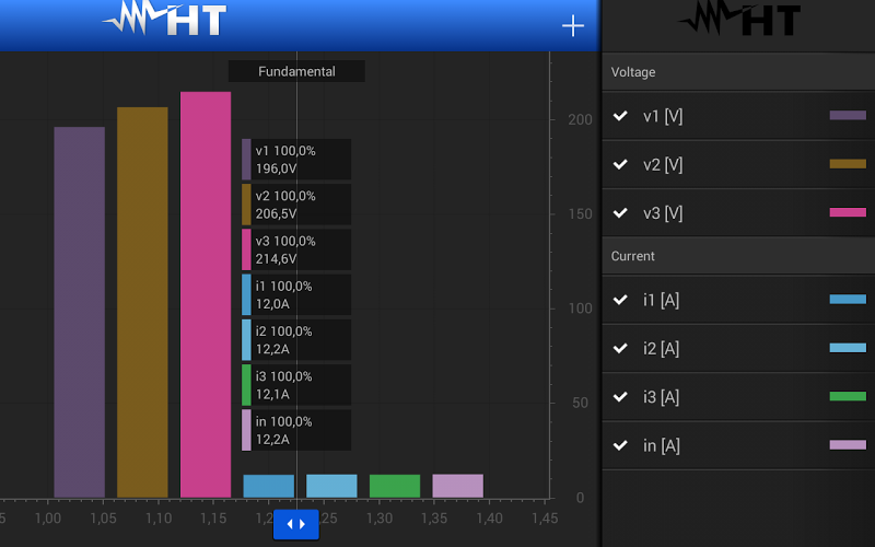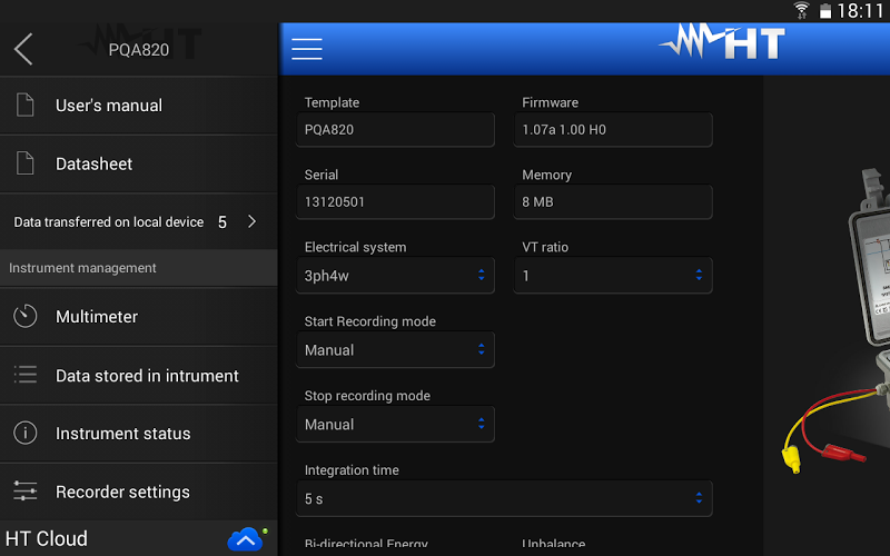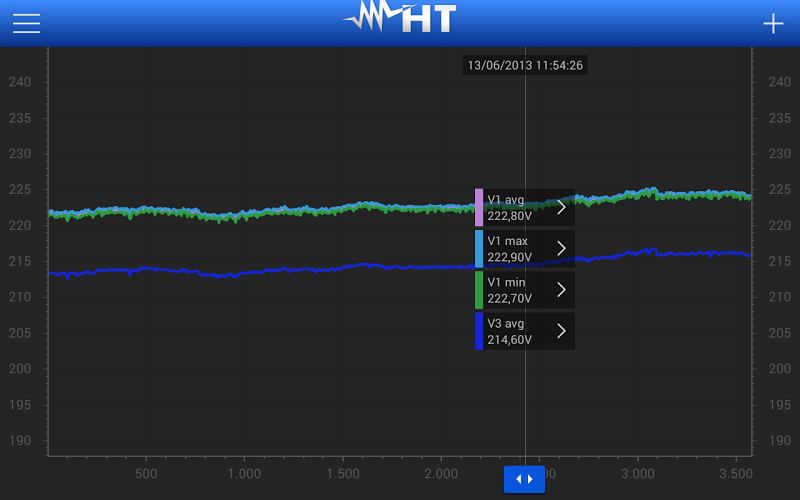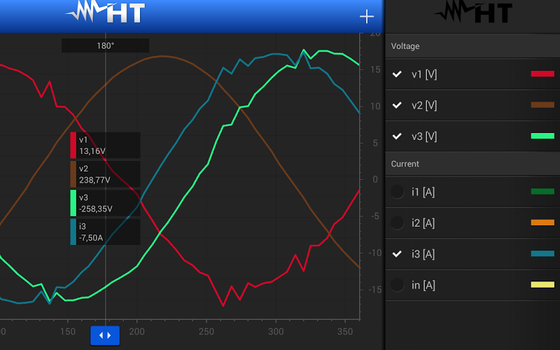 Rozhraní svůj nástroj HT pomocí tabletu Android: Displej dotykové obrazovky vám umožňuje rychle a důkladně vyhodnotit trend zaznamenaných množství, takže snadno najdete okamžité řešení problémů souvisejících s energetickou odpadem a elektrickou bezpečností a také elektrickou bezpečnost .