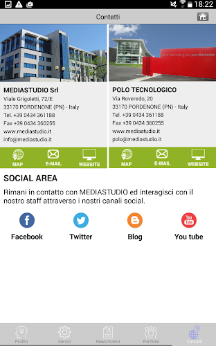 MediaStudio se zabývá IKT a zaměřuje své hlavní podnikání na tři konkrétní oblasti: webové služby, software 3D designu, multimédia a mobilní aplikace. Stock ”přiřazený Area Science Park v Triestu, pro inovační a výzkumné aktivity dosažené ve Friuli v.g.Inovativní a avantgarde, Mediastudio rozrostla sdílení nejmodernějších a nejúčinnějších nástrojů pro web (B2B a B2C CRM) se svými zákazníky .